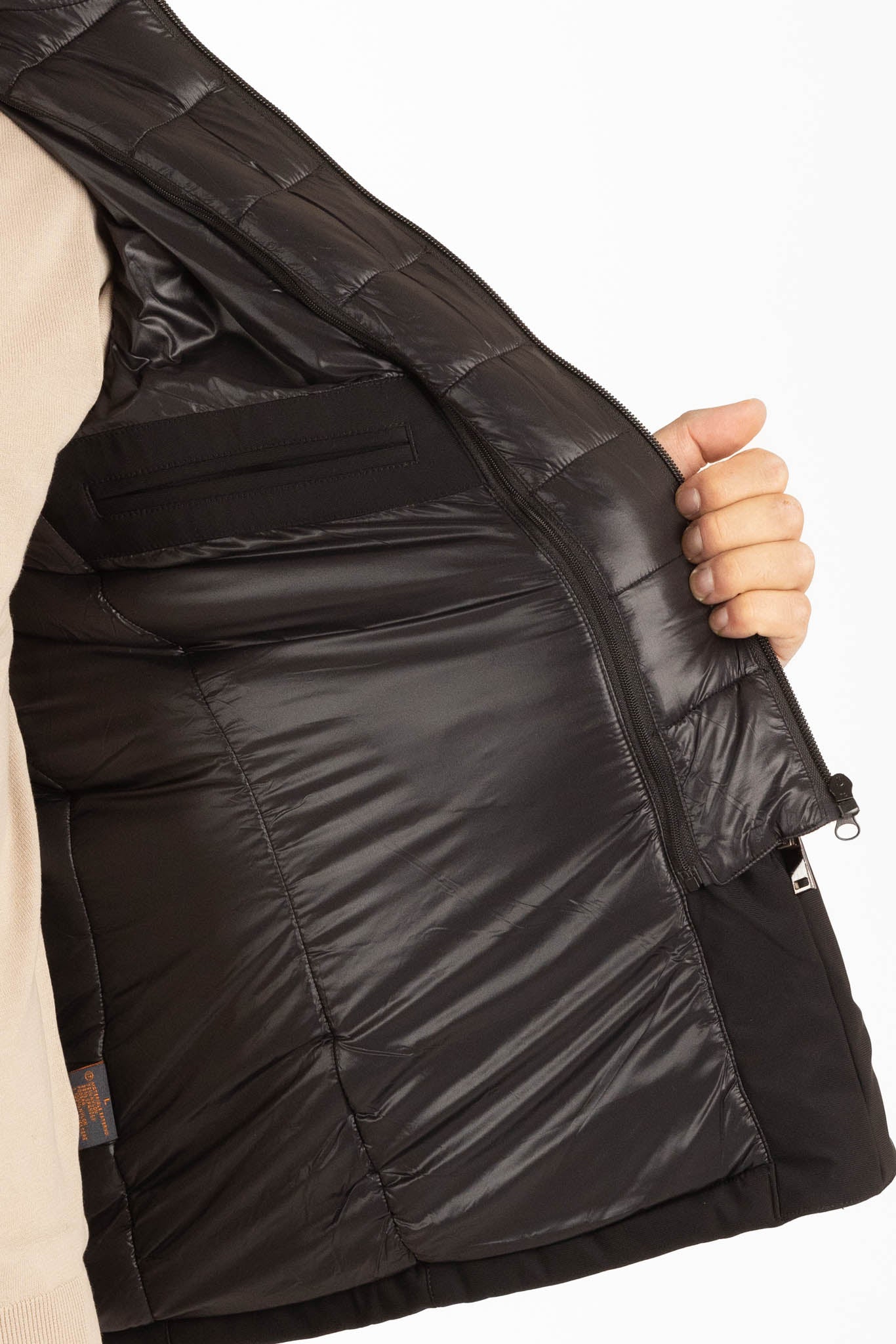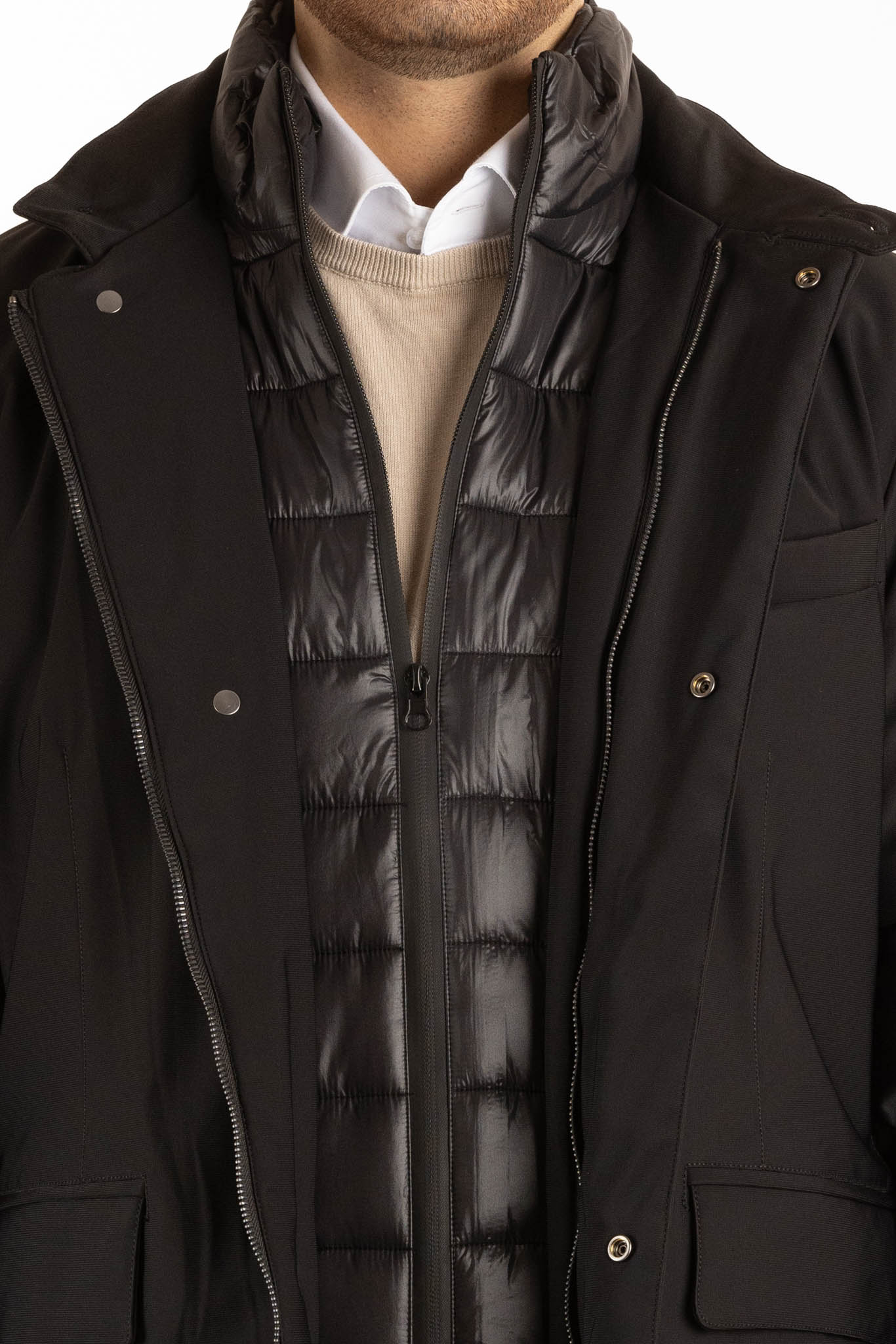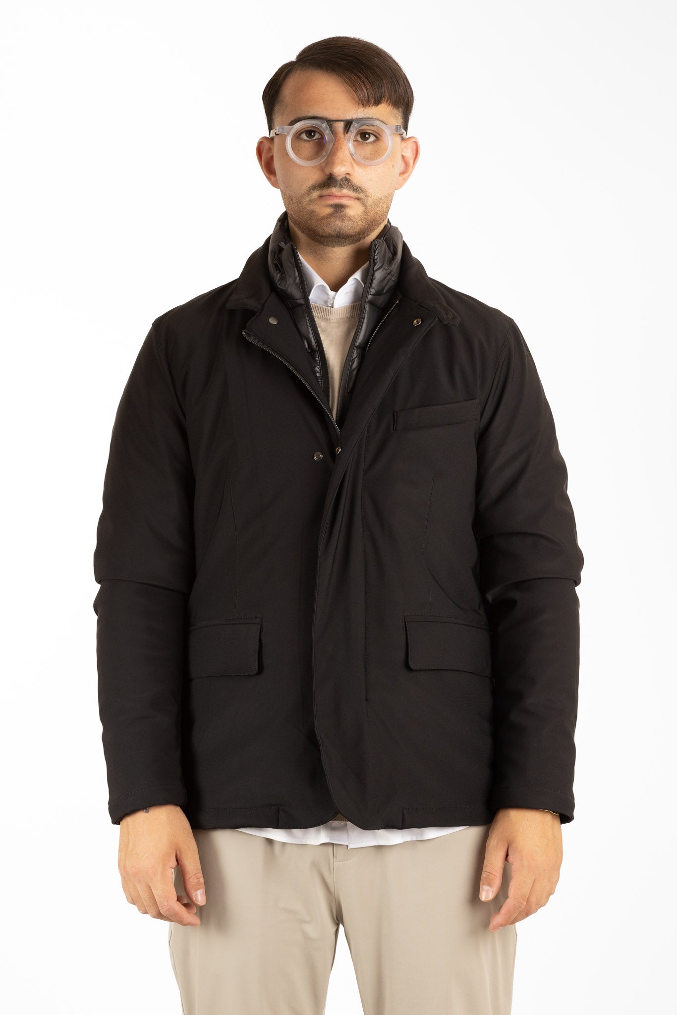 Jacket with water-repellent fabric and internal bib. Elegance and sportiness in one garment