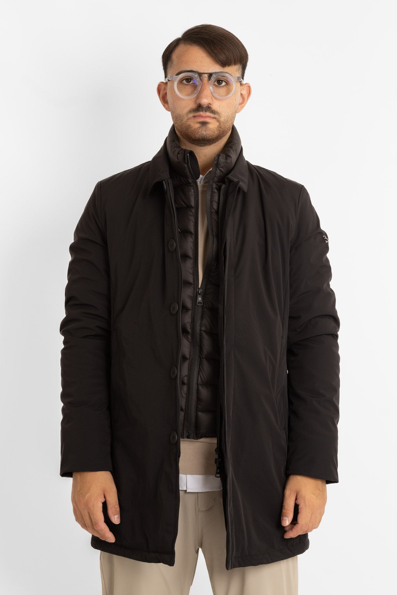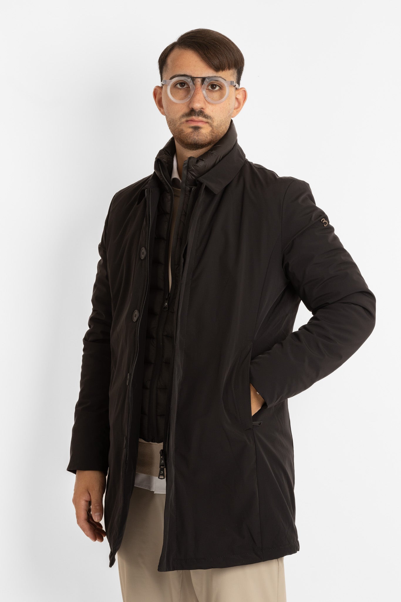 Trench-Coat en tissu technique TROIS FRÈRES. Une fantastique veste d'hiver, en tissu technique imperméable, idéale comme couverture de manteau. Chaleureux, confortable, confortable. Testé même sous les climats les plus rigoureux, parfait pour des températures inférieures à 10° et jusqu'à -10°, il protège également de l'humidité