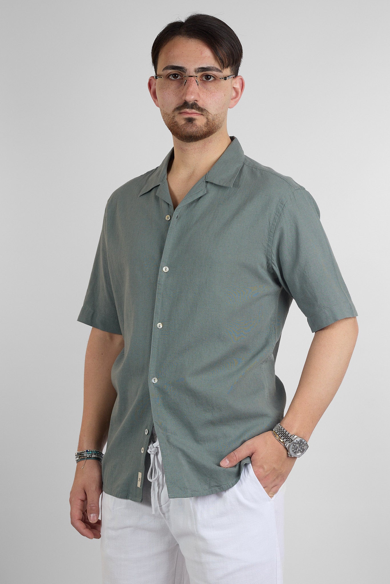 Camicia Mezza Manica Bowling Misto Lino | Verde