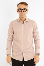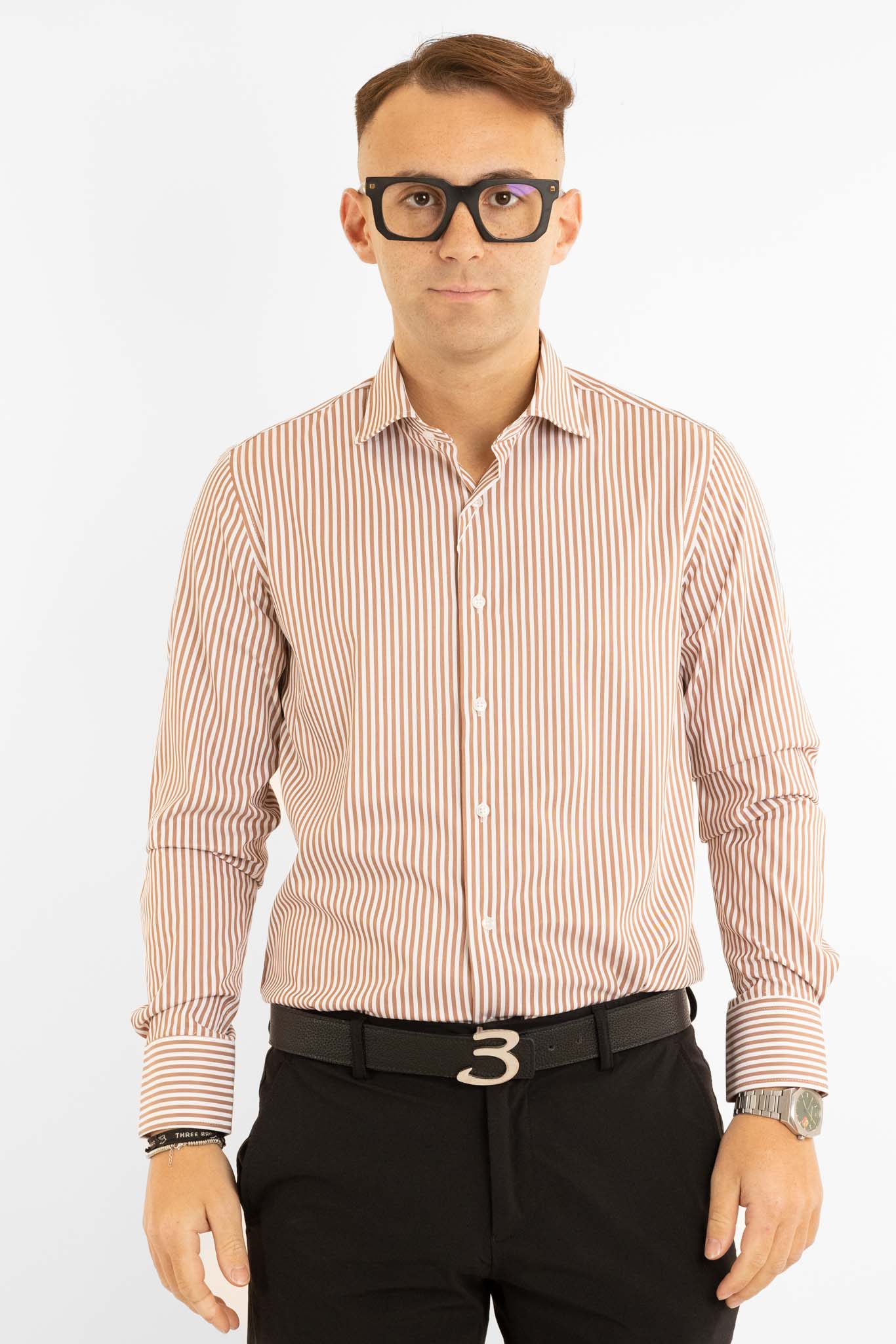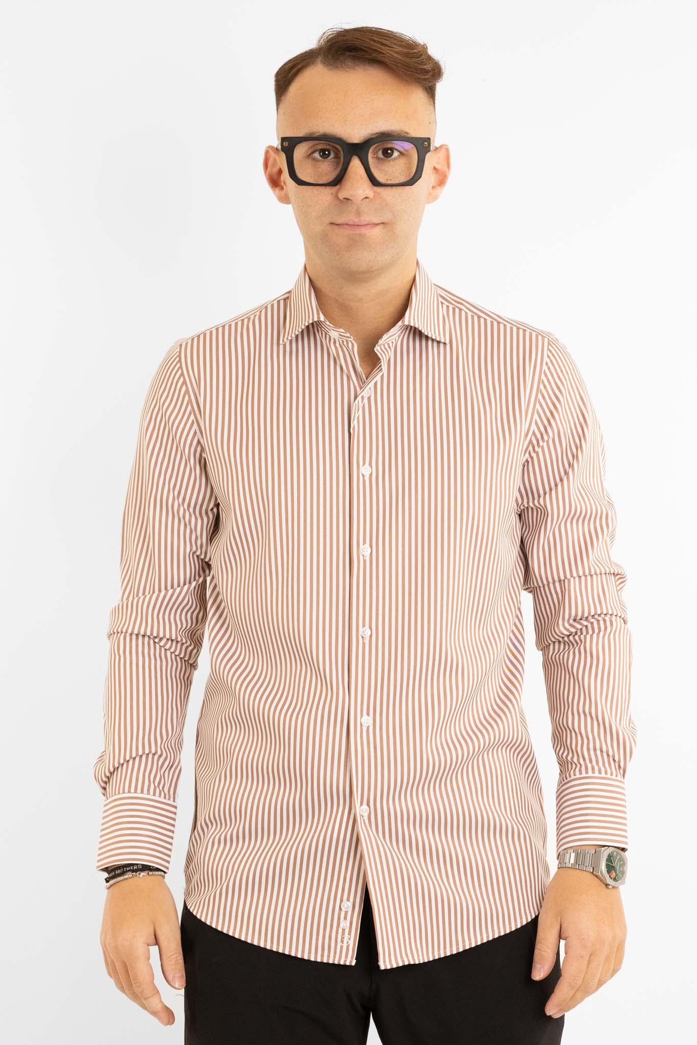 Camicia No Stiro Slim Doppio Ritorto Riga Larga | Tabacco