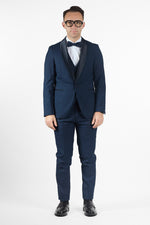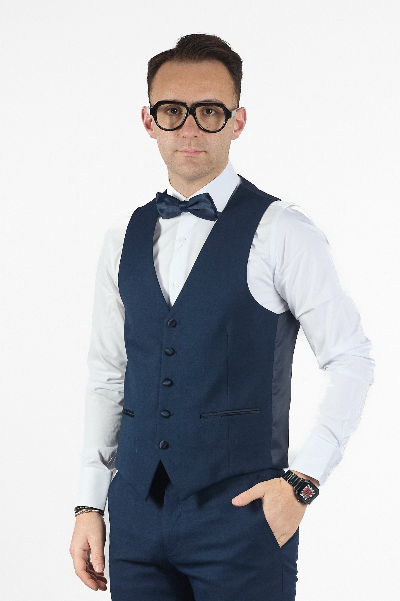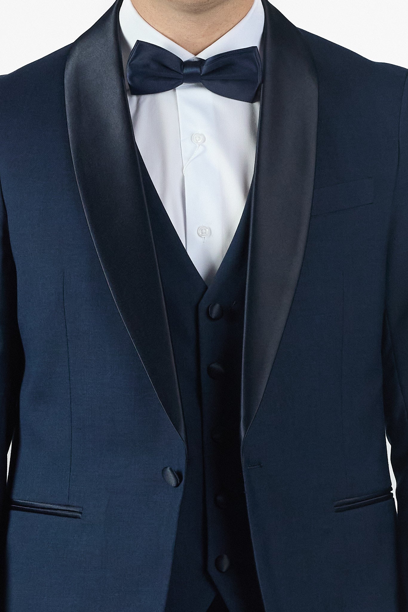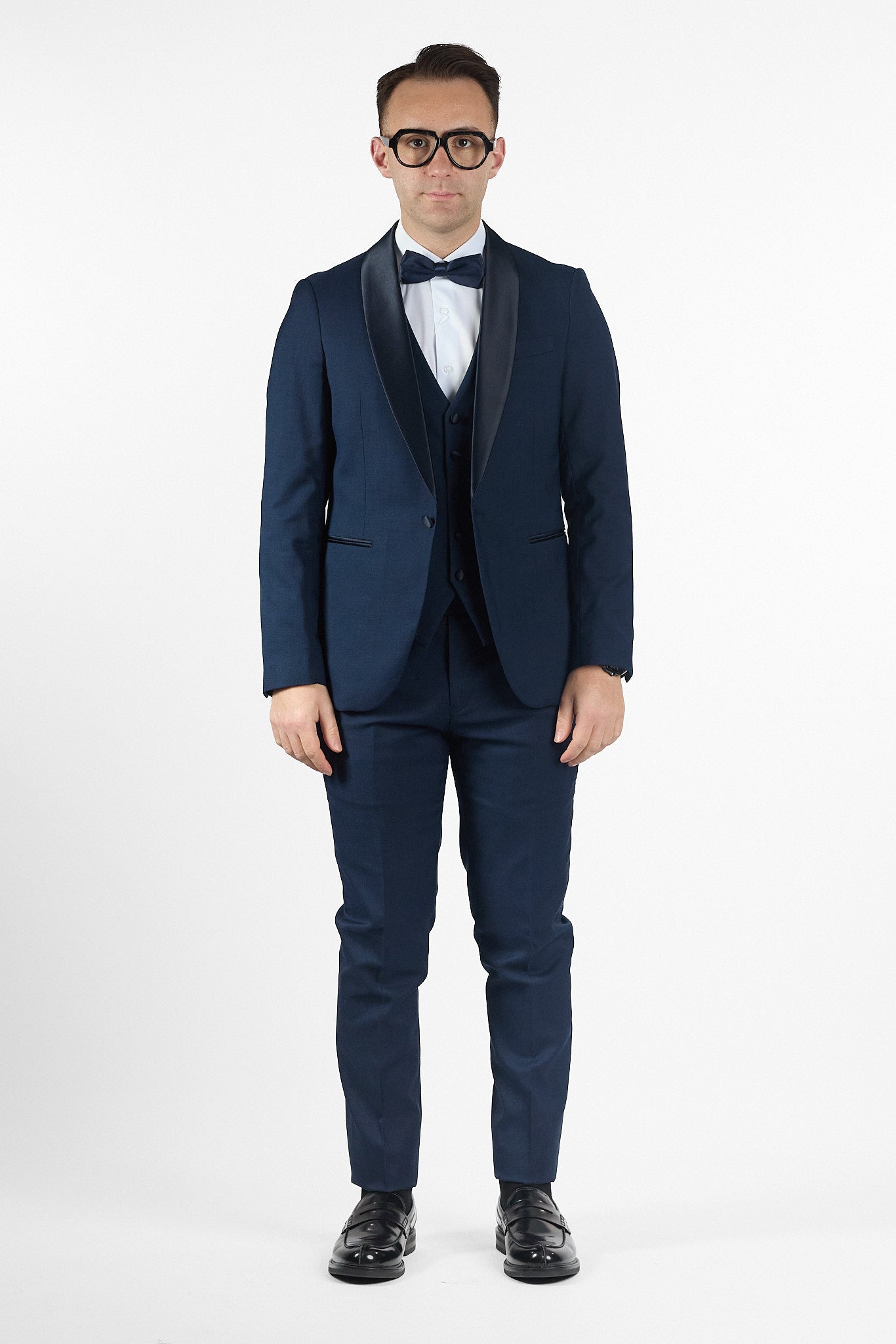 Smoking mono bottone in raso, i bottoni con le maniche impreziositi col raso valorizzano l'abito, così come il gilet perfettamente regolabile. Abito con pantalone modello slim. Il pantalone presenta tessuto extra interno per essere allargato ulteriormente fino a 4 centimetri.